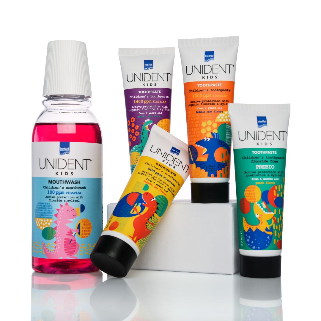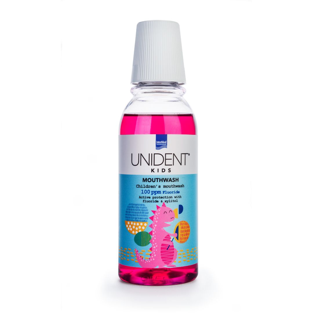 Unident kids tečnost za ispiranje usta je oralna vodica za ispiranje usta sa fluorom za svakodnevnu upotrebu, posebno dizajnirana da zadovolji potrebe usne duplje dece. Sadrži fluor koji jača zube i zbog svog posebnog sastava sprečava stvaranje mikrobnog plaka, čak i na najtežim mestima do kojih četkica ne dopire, a štiti delikatne dečje desni. Odličnog ukusa koji oduševljava decu, idealan je partner za zdrave zube i desni.